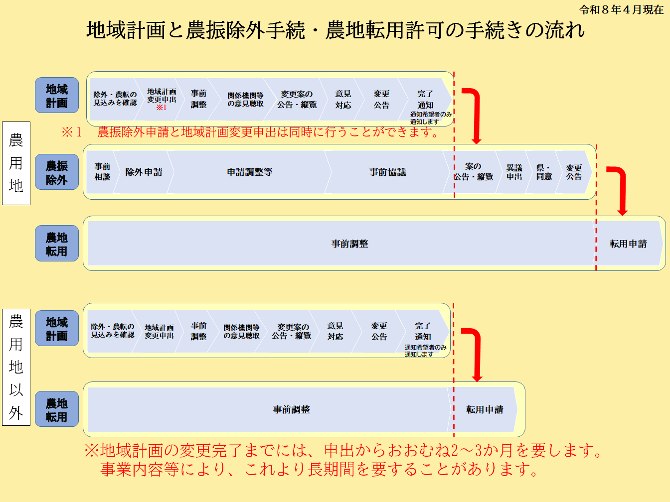 これに伴い、令和7年4月以降、農振除外申請や農地転用許可申請を行う場合、申請対象の農地が地域計画内の農地※であるときは、事前に地域計画変更申出書等の提出による地域計画の変更が必要となります。