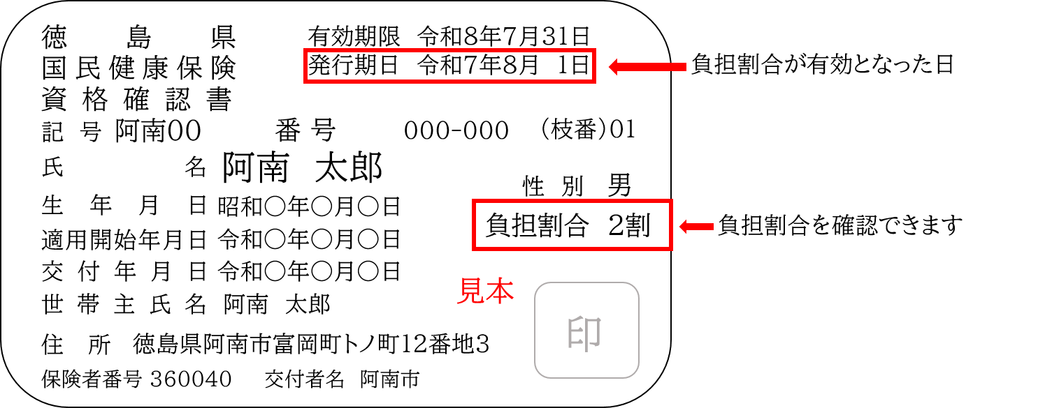 負担割合は前年の収入および所得等により判定を行います。収入および所得の変更や世帯構成の変更等により負担割合に変更があった場合は、有効期限内であっても負担割合が変更となる可能性があります。その場合は変更後の負担割合を記載した資格確認書、または資格情報のお知らせをお送りしますので、変更前の資格確認書、または資格情報のお知らせはご返却ください。