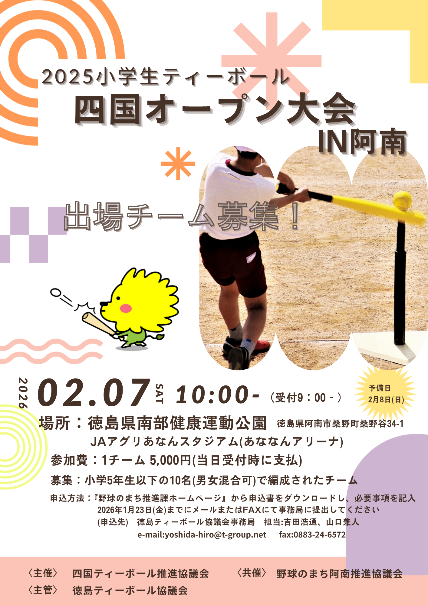 小学生ティーボール四国オープン大会が、下記のとおり徳島県阿南市にて開催されます。皆様奮ってご参加ください。