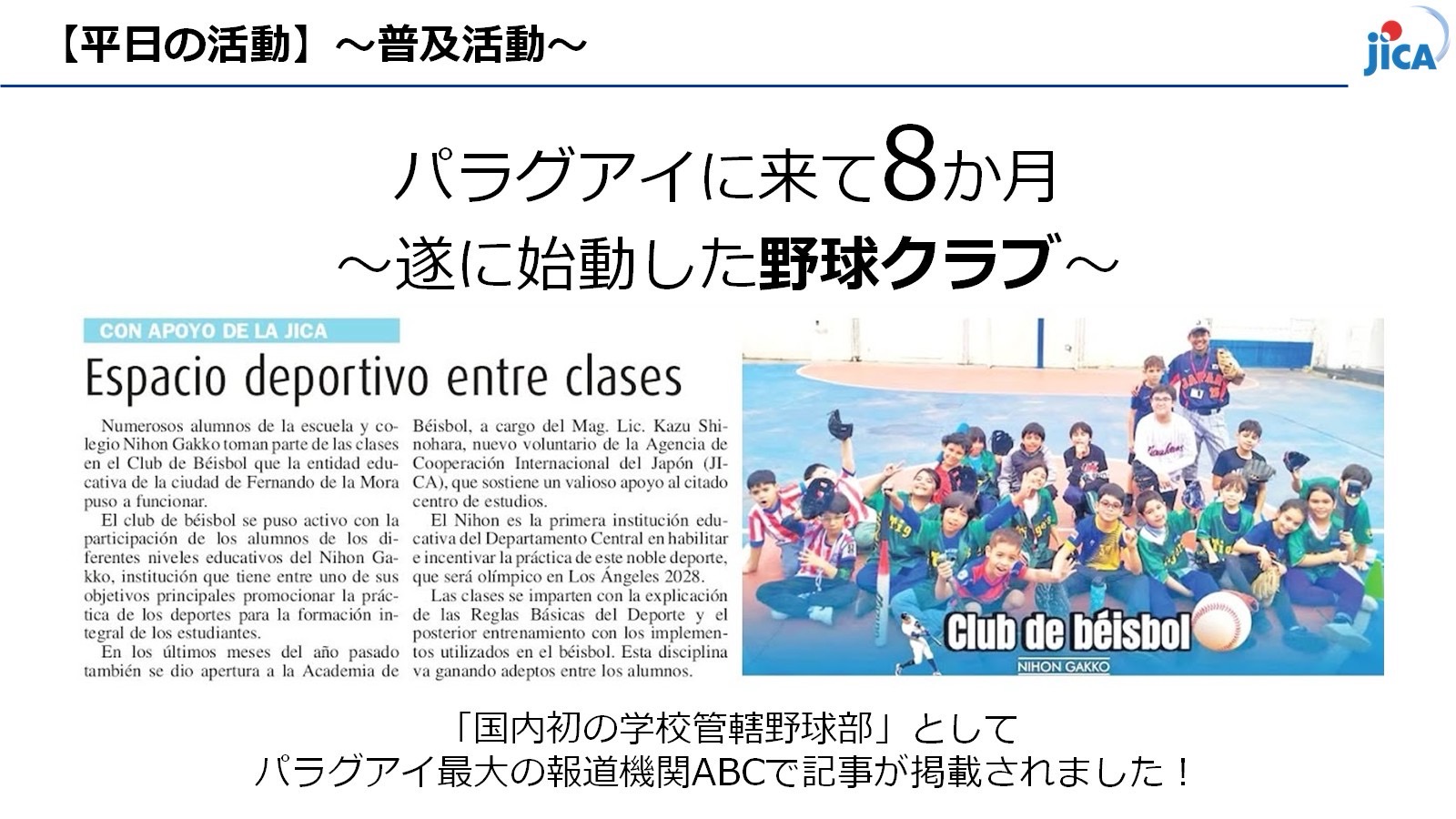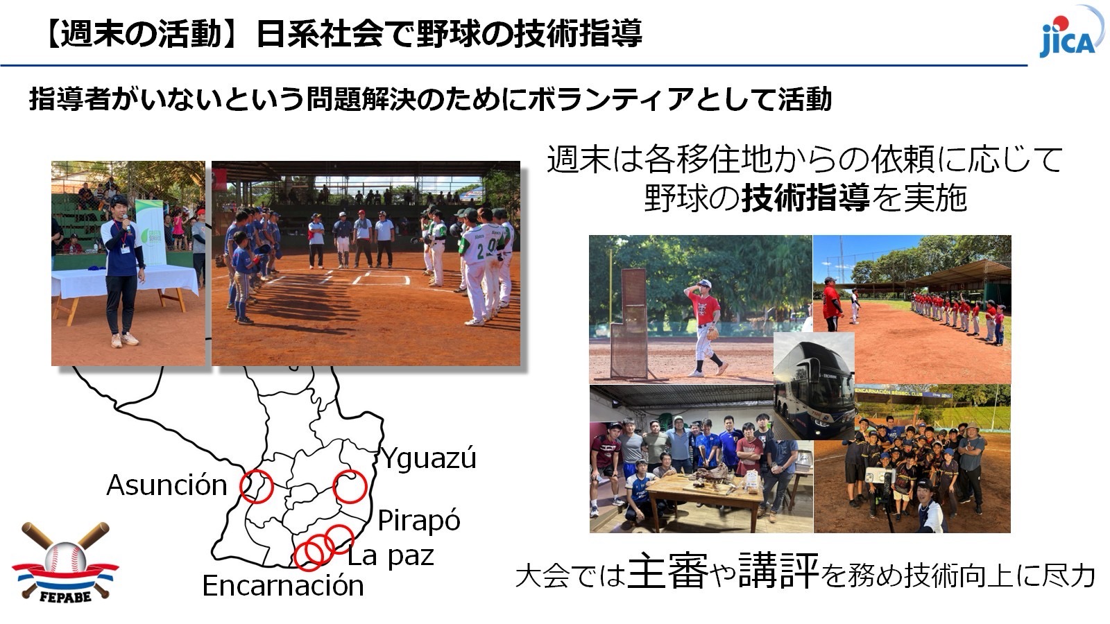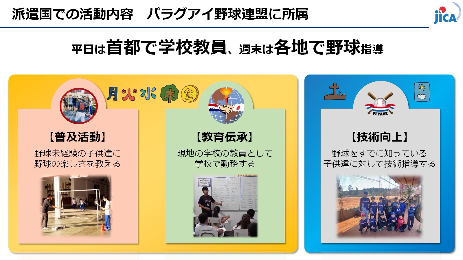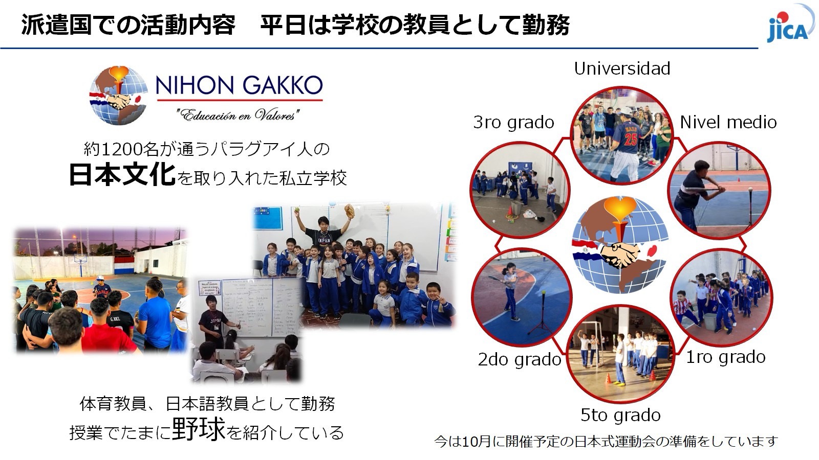 篠原さんからは、これまでの経験や現地での取り組みが紹介され、学校での授業の様子や地域の子どもたちへの野球指導、スペイン語を使ったコミュニケーション、立ち上げた野球クラブの活動など、派遣先での最新の状況が報告されました。