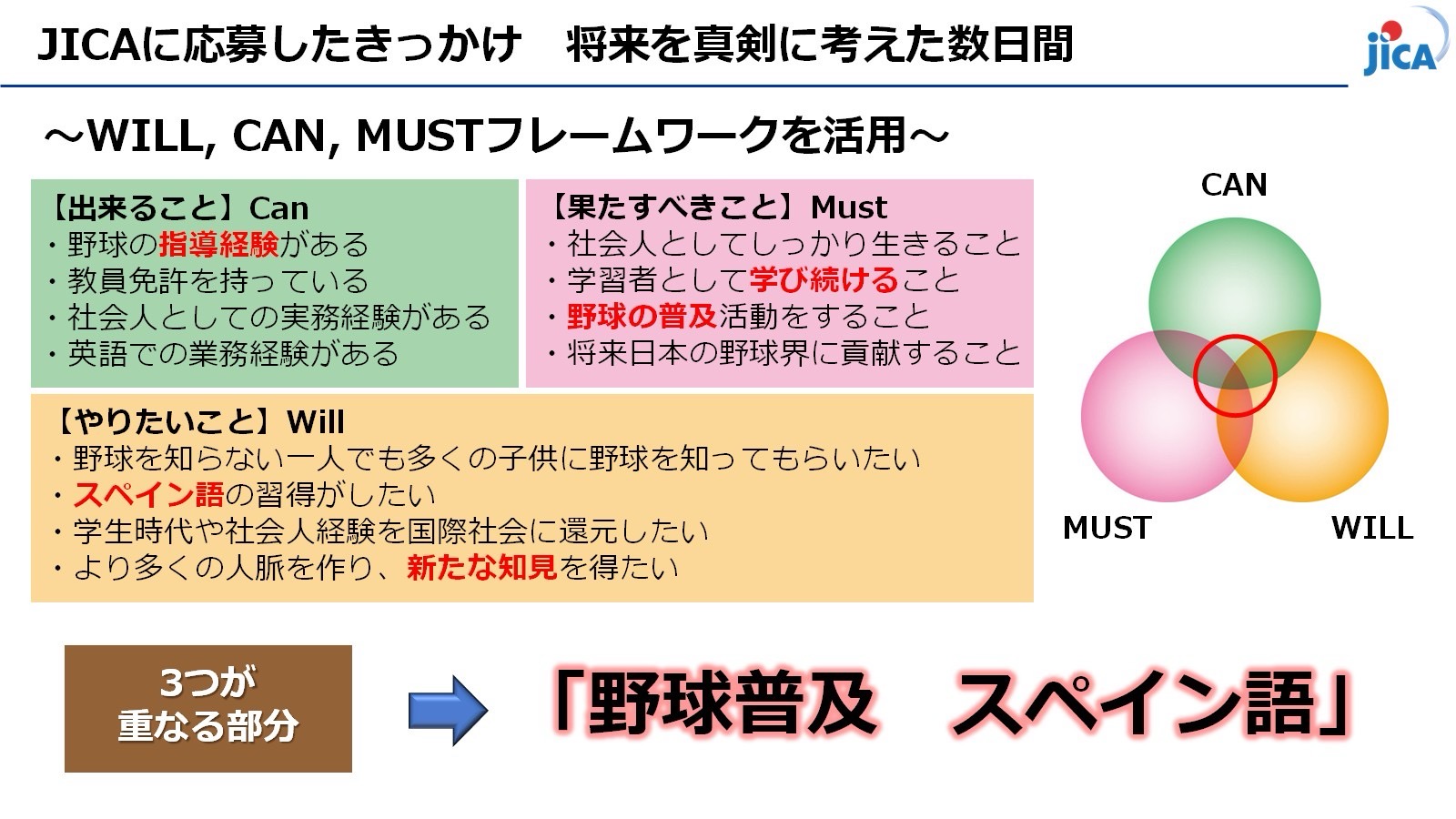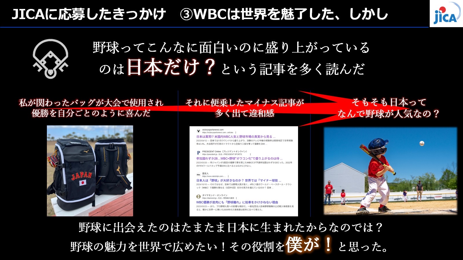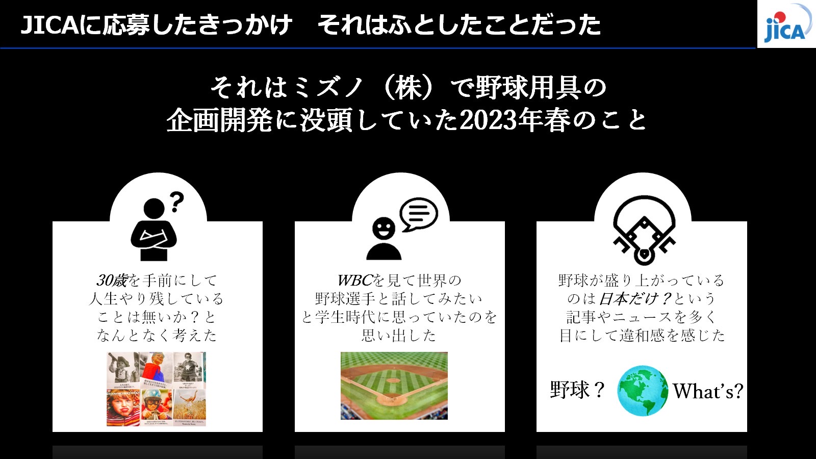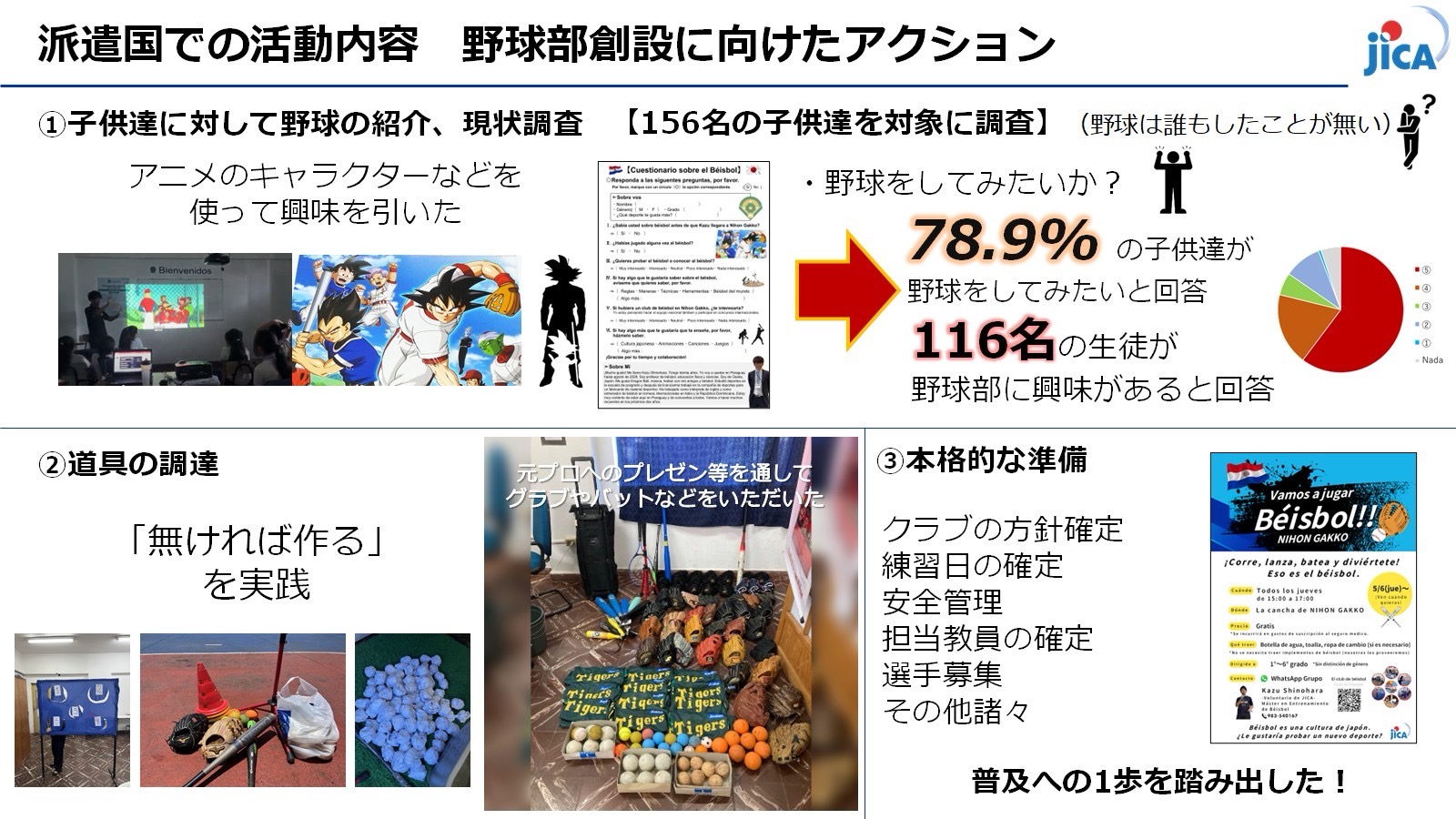 篠原さんからは、これまでの経験や現地での取り組みが紹介され、学校での授業の様子や地域の子どもたちへの野球指導、スペイン語を使ったコミュニケーション、立ち上げた野球クラブの活動など、派遣先での最新の状況が報告されました。