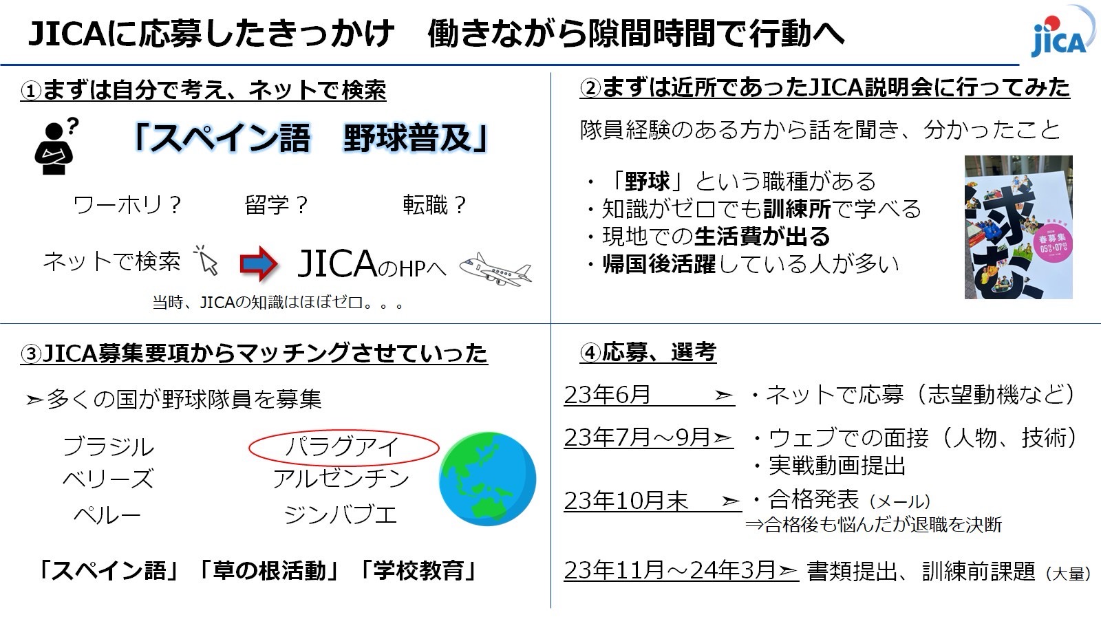 JICA四国センターは、令和7年9月14日(日)、徳島県国際交流協会(TOPIA)において「JICA海外協力隊中間・帰国報告会&募集説明会」を開催し、当日は中南米パラグアイで活動している 阿南市出身の篠原 果寿(しのはら かず)さん(野球隊員) がオンラインで登壇しました。