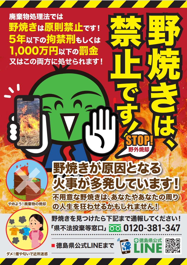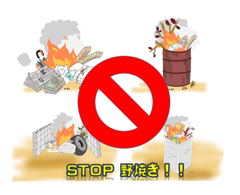 ※例外での野焼きにおいても、周辺環境に悪影響を及ぼしている場合などは行政指導の対象となり、焼却を中止していただく場合もありますので、苦情が発生しないように風向き、場所等に配慮してくださいますようお願いします。