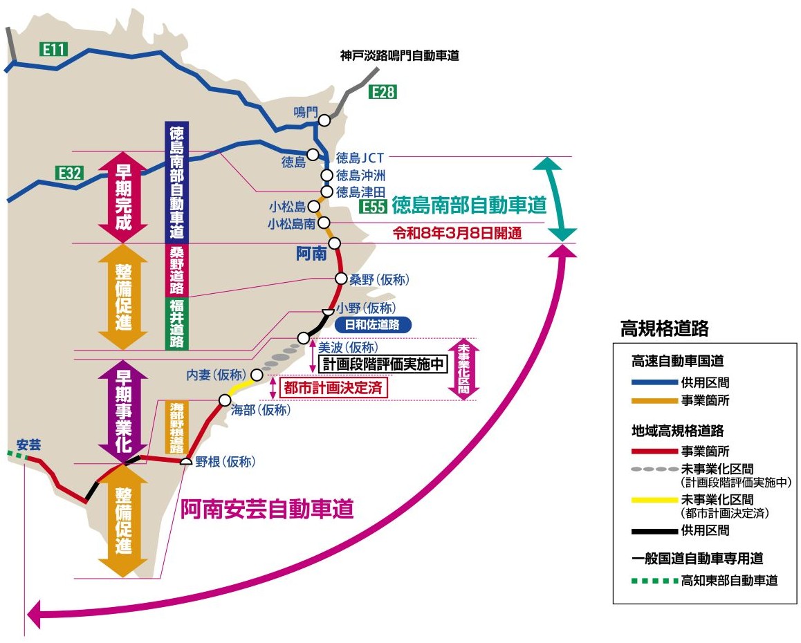 本日、国土交通省四国地方整備局徳島河川国道事務所より、徳島南部自動車道「小松島南IC~阿南IC」間が令和8年3月8日(日)に開通する