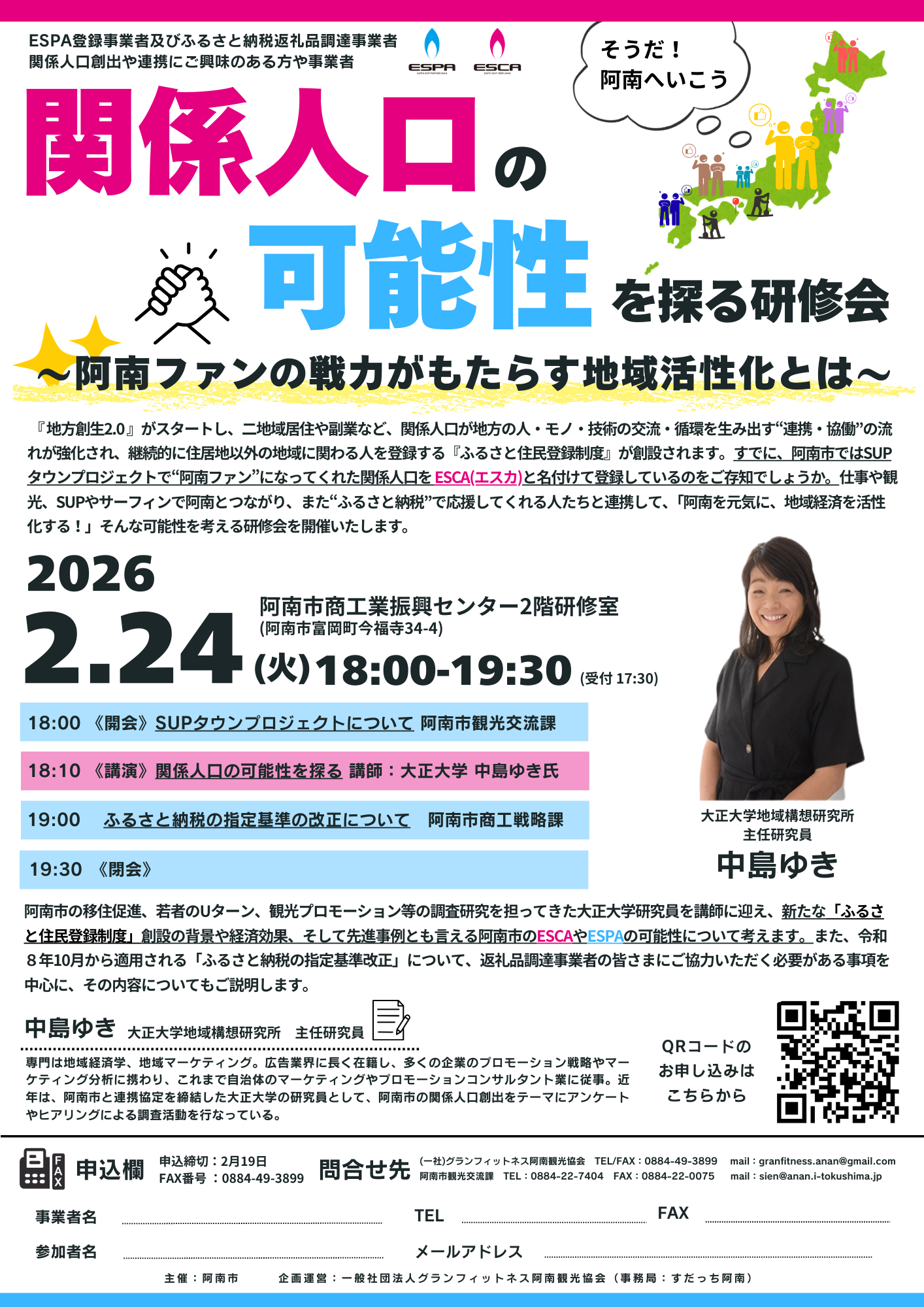こうした関係人口として、仕事や観光、SUPやサーフィン等のアクティビティを通じて阿南とつながり、さらには「ふるさと納税」により阿南を応援してくださっている「阿南ファン」の皆さまと連携し、「阿南を元気にし、地域経済を活性化する」その可能性について考える研修会を開催します。