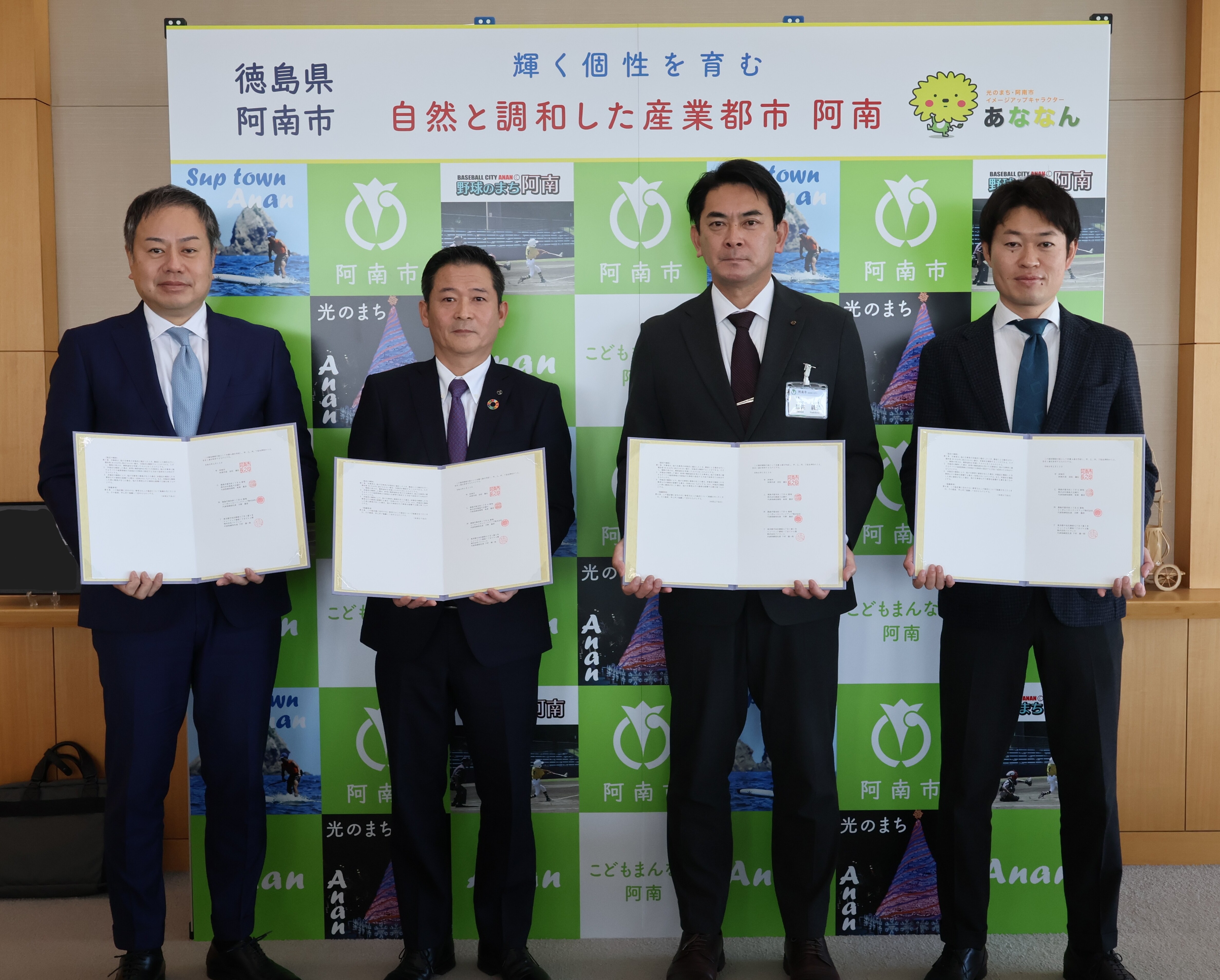 阿南市は、株式会社徳島大正銀行、とくぎんトモニリンクアップ株式会社及び株式会社バイウィルと「環境価値を活用した地域脱炭素の取組に関する連携協定」を締結しました。