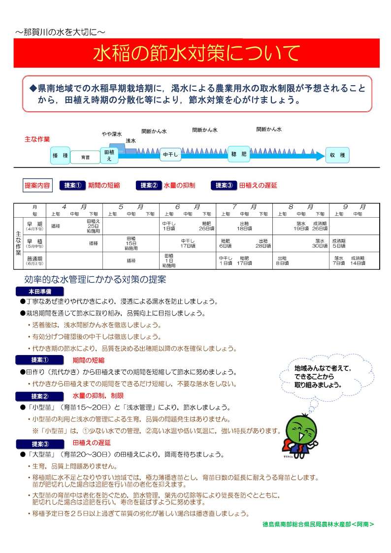公開日 2026年02月20日 昨年11月以降、少雨が続き、ダムの貯水率も低下していることなどから、今後の農業用水の確保や農作物の生育への影響が懸念される状況が続いています。 こうした状況を踏まえ、令和8年2月20日から徳島県南部総合県民局 農林水産部<阿南>において「渇水に関する営農相談窓口」が開設されておりますので、ご活用ください。 また、今後の気象状況等によっては、渇水による農業用水の取水制限が実施される可能性もあることから、田植え時期の分散化などにより、節水対策にご配慮をお願いいたします。 なお、水稲の節水対策について下記のチラシに具体的な提案をお示ししておりますので、ご参照ください。 相談先 徳島県南部総合県民局 農林水産部<阿南>(富岡町あ王谷46) 電話:0884-24-4187 なお、徳島県渇水相談窓口のお知らせはこちら 相談内容 作物ごとの渇水対策 被害軽減のための管理方法 今後の営農計画の見直し など 受付時間帯 9時00分~17時00分(土日、祝日を除きます) お問い合わせ 産業部 農林水産課TEL:0884-22-1598FAX:0884-22-1282E-Mail:nourin@anan.i-tokushima.jp